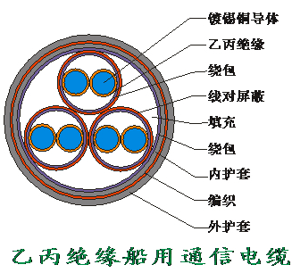 乙丙J緣船用通信電纜適用于河海船舶及水上建筑物傳輸電能,及話音信息,也可用于連接船用一般儀表和控制設備。